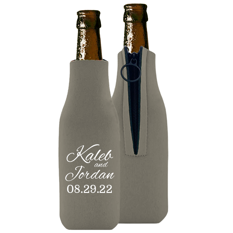Bottles need to wear something nice at weddings, too. Made of the same material as wetsuits, our neoprene bottle coolers will keep everyone's beverages nice and cold, look great in your guests' hands, and provide a perfect keepsake for your special day.