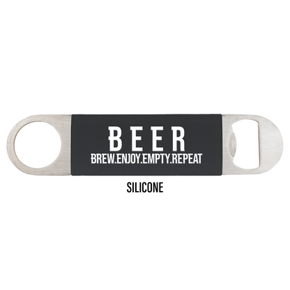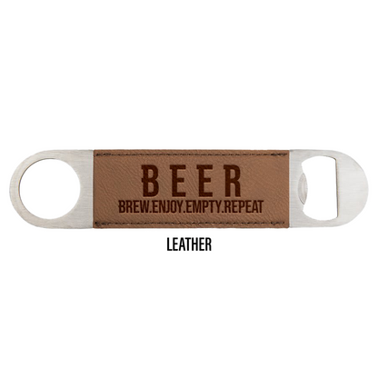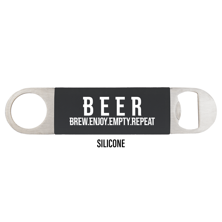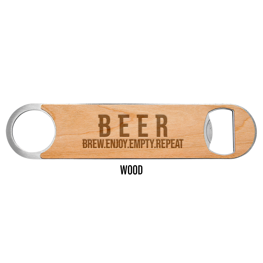 Choose between our 3 premiere materials. Pop open your next brew with these trendy B.E.E.R engraved bottle opener packs. Enjoy your beer, then use the opener to quickly empty and repeat.